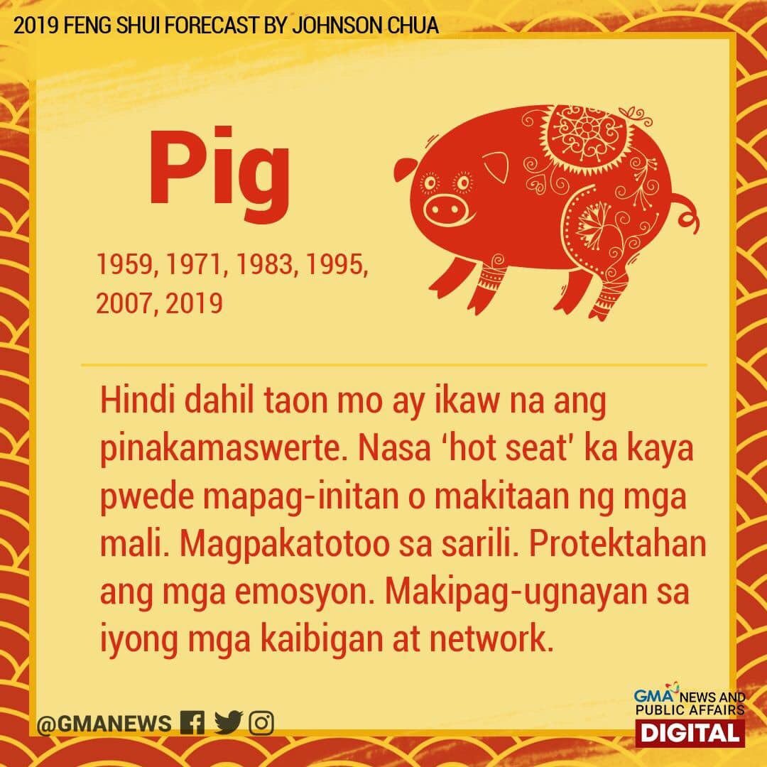 Ayon sa isang feng shui expert hindi suwerte ang mga may sign na Pig sa susunod na taon kahit pa Year of the Earth Pig sa 2019. Ang mga mamamayagpag naman daw at buwenas sa 2019 ay ang mga sign na minalas ngayong 2018. Maglagay ng barya sa bulsa at magbilang ng pera sa harap ng pintuan.