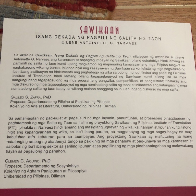 Isang dekada ng pagpili ng salita ng taon. Narvaez Eilene Antoinette G Author Corporate Authors. Sawikaan isang dekada ng pagpili ng salita ng taon.